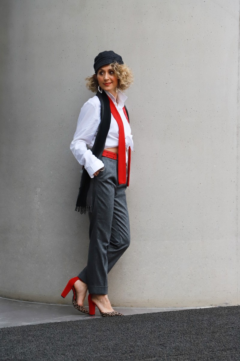 First of all, The tied-up Tummy white shirt looks so feminine with the untied tie look in a Man Navy knitted red tie. Secondly, the plaid wool scarf replaces the balance between red and black colour. As a result, this composition works best with knee-length men overcoat. Furthermore, I paired a reversible dreadlock poorboy hat with animal print pumps to refresh the high waisted tweed slim fit trouser in dark grey. Now that is real style.