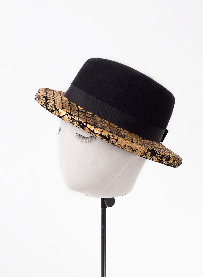My latest collection is called “Tenera”. I took inspiration from modern artists such as Gustav Klimt, Yves Klein, and their techniques of integrating metallic foiling into the paintings. I love the effect of shiny metallic surfaces and was searching for a way of applying it to millinery.