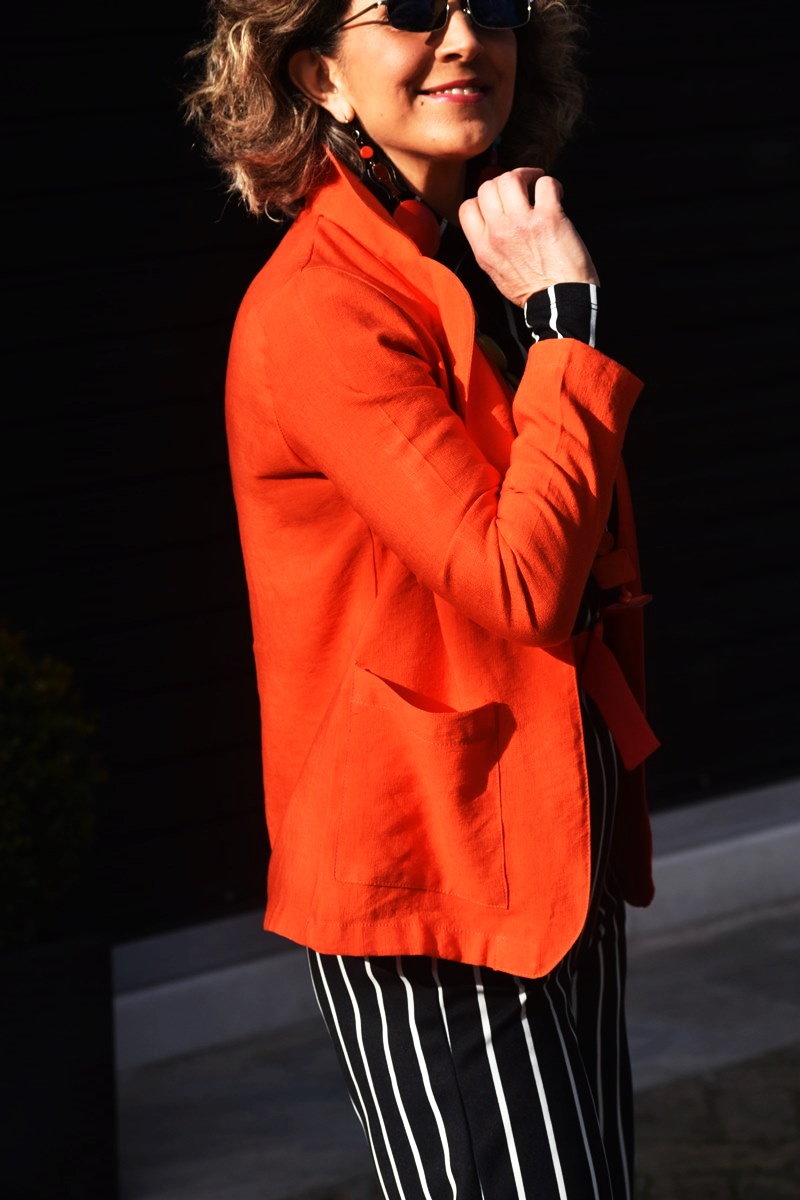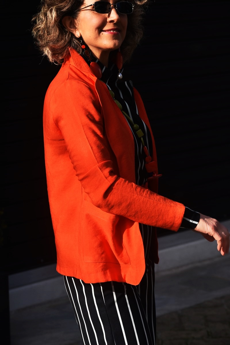 Best style ideas to layer my wide-leg jumpsuit have to do with new flexibility in womenswear colours. The orange blazer women’s designed by Omar Mansoor’s AW21 collection suit perfectly with the vertical striped jumpsuit. Afterwards, Orange is a powerful colour, ready for action, bold, and beautiful. Be flexible, dare to abandon old formulas. To sum up, Street fashion for 2021 during Paris fashion week 2021 look different, joyful, and embrace vibrant colour shades. A good orange blazer combination makes me look trendy, ready to brighten up my hottest outfits in Paris.