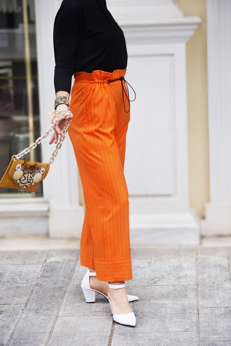 Are wide-leg pants flattering? Thanks to the high waist they make your legs appear longer, creating an incredibly flattering silhouette. I love these pants for their versatility that makes them feel extremely comfortable. Are wide-leg pants in style 2021? Yes, they are still in style, and you can wear them with absolutely anything. What to wear with wide-leg pants in orange colour by Omar AW21 collection? Dare to pair them with A black sleeveless blazer and striped bralette. A bralette looks so pretty, feminine, and comfort. This look will be your season 2021 best friend. As comfort continues to become my everyday essential for Parisian Chic style, the wide-leg pants outfits in vibrant orange colour add newness to my experimental pairings. The eclectic look has always to do with playful, tailoring pieces.
