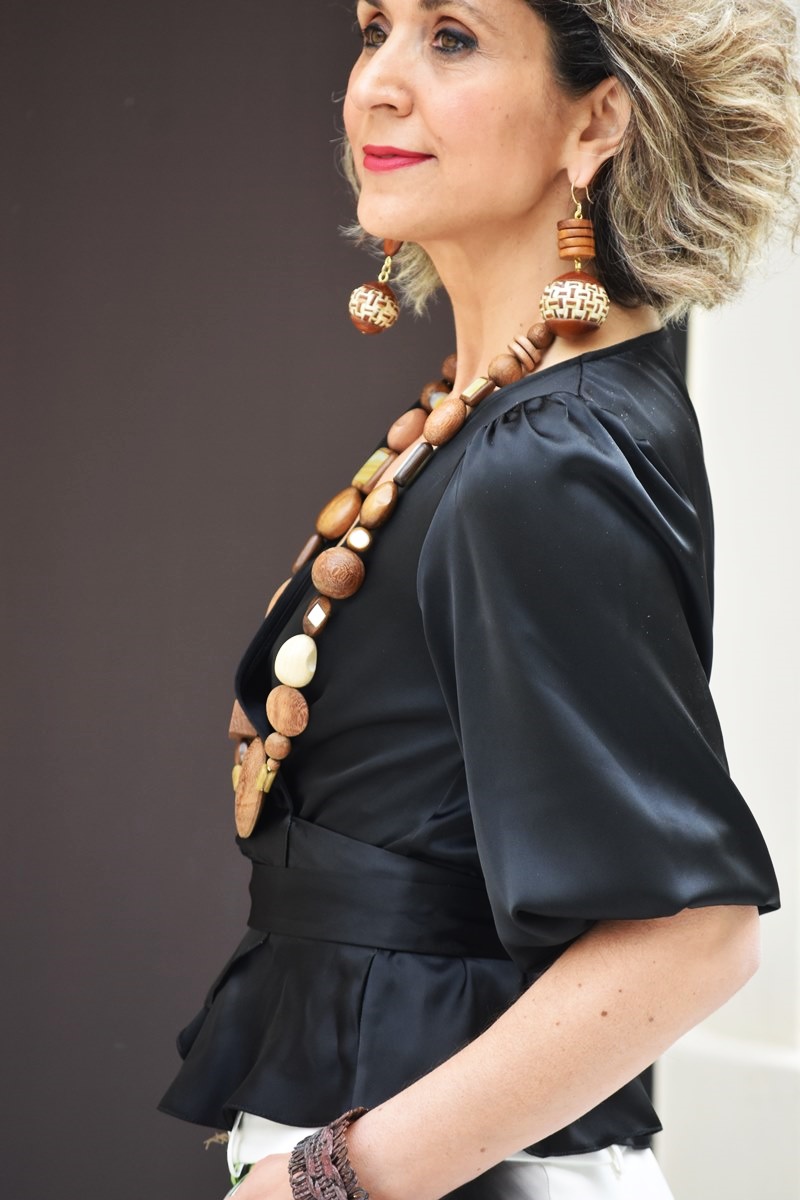 Simplicity is key to the Parisian style. Instead, everyday essentials with stylish white pants are the keynote of all true elegance. To create a beautiful Parisian style with the black v-neck blouse, I focused on neutral colours of Fashion earrings, necklaces, and bracelet. That is to say, natural materials of Fashion accessories 2021 like wood offer an exceptional style to fashion essentials. Time to turn towards what we value, paying attention to what we wear and create our 2021 fashion trends. In my creative imagination, restrictions during the Covid-19 crisis make my everyday essentials a priority. In conclusion, types of clothing that allow combining each other and create something special, unique.