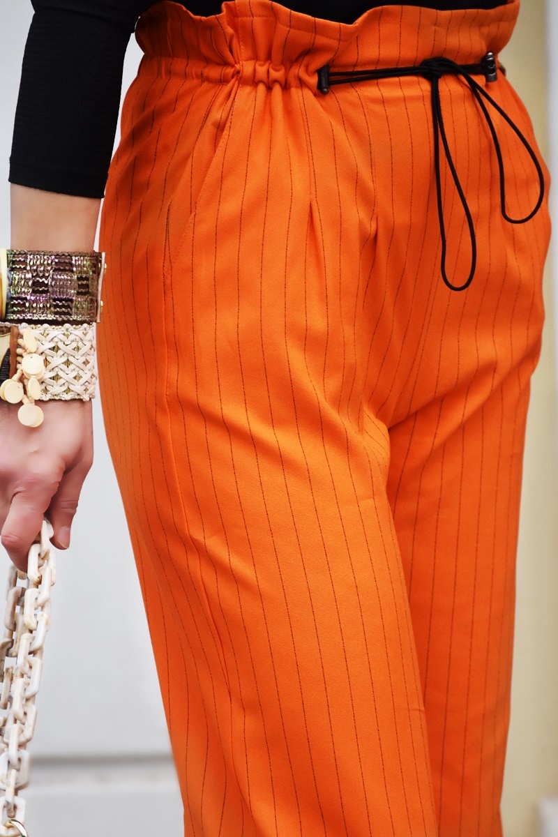 Are wide-leg pants flattering? Thanks to the high waist they make your legs appear longer, creating an incredibly flattering silhouette. I love these pants for their versatility that makes them feel extremely comfortable. Are wide-leg pants in style 2021? Yes, they are still in style, and you can wear them with absolutely anything. What to wear with wide-leg pants in orange colour by Omar AW21 collection? Dare to pair them with A black sleeveless blazer and striped bralette. A bralette looks so pretty, feminine, and comfort. This look will be your season 2021 best friend. As comfort continues to become my everyday essential for Parisian Chic style, the wide-leg pants outfits in vibrant orange colour add newness to my experimental pairings. The eclectic look has always to do with playful, tailoring pieces.