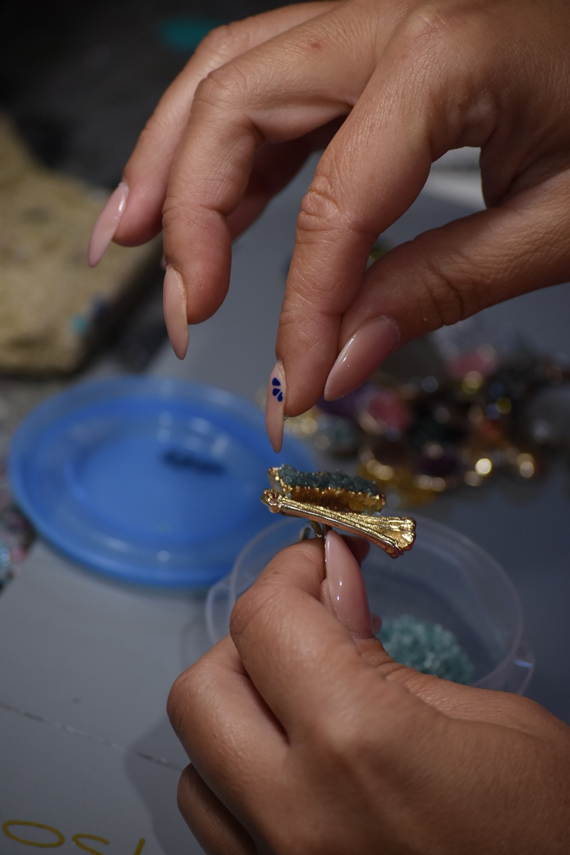 Adorning the hands, the rings dazzled with their geometric and abstract designs, each set with sparkling white stones that sparkled like fleeting moments of clarity amidst a vibrant palette. The cuff bracelets, wide and striking, wrapped around the wrists like captivating sculptures, their rich hues of gold, deep green, and burgundy merging beautifully to create an alluring display. Tina’s pieces speak. They embrace the body as an extension of it, turning movement into story.