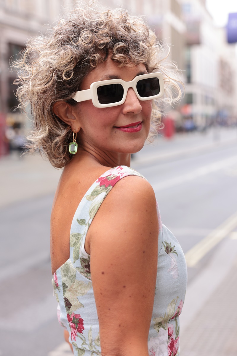 Chic sunglasses enhance the sophistication of the look, while brightly coloured pumps create a vibrant contrast. Above al, with its strong feminine design, this floral bustier ensures I stand out and leave a memorable impression in any setting.