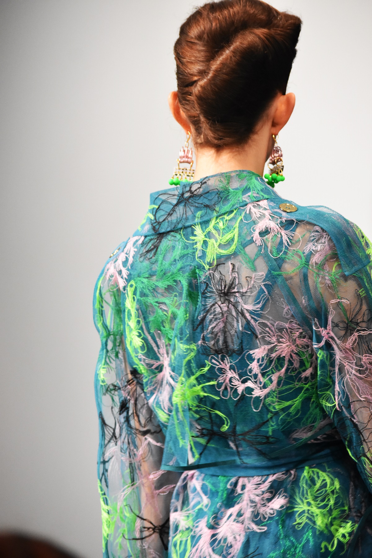Highlights of their Autumn/Winter 2019 collection a tulle trench freehand embroidered with leaf insects inspired by a visit to Manchester Museum. An exceptional collaboration between LONGSHAW WORD and JOHN SMEDLEY knitwear.