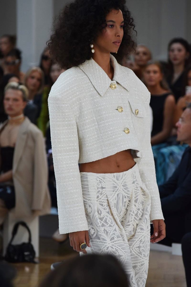 Another highlight of the collection I loved was the swing coats. These swing coats, also available in cream with gold braid trim, added a sense of movement and flair to the looks. On the other hand, The oversized silhouette created a relaxed yet polished aesthetic, making them a piece for any occasion. Whether paired with the wide-leg linen trousers or the cotton lace trousers, the swing coats added an element of sophistication and refinement. To sum up, With their timeless design and impeccable craftsmanship, these swing coats were a testament to Paul Costelloe’s expertise in creating timeless and elegant fashion.