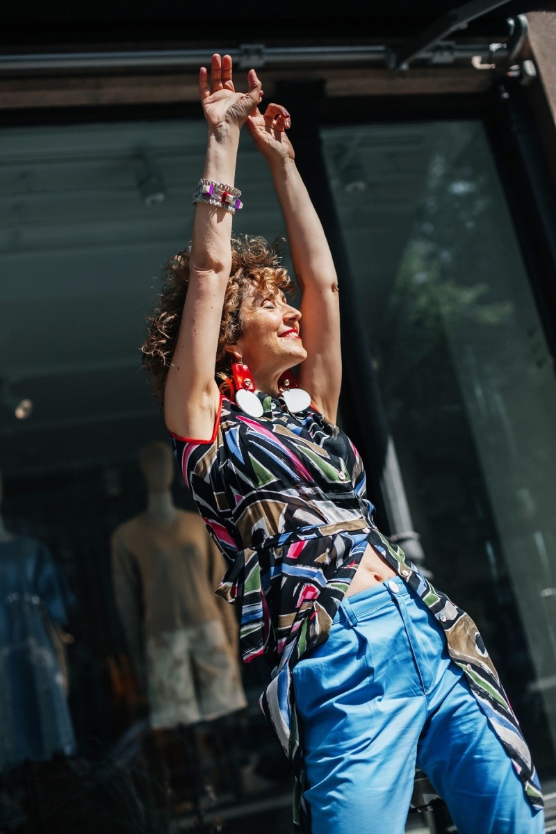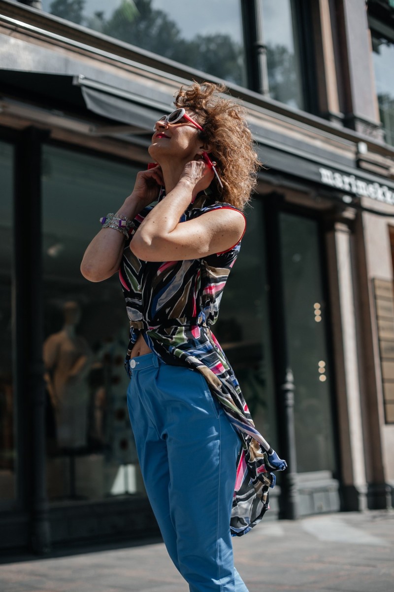 For my London outfits, it looks so flattering to wear with bright blue straight-leg trousers. Free as the wind, the Think-Feel-Discover.com printed button-down shirt becomes a classic piece that every woman should own.