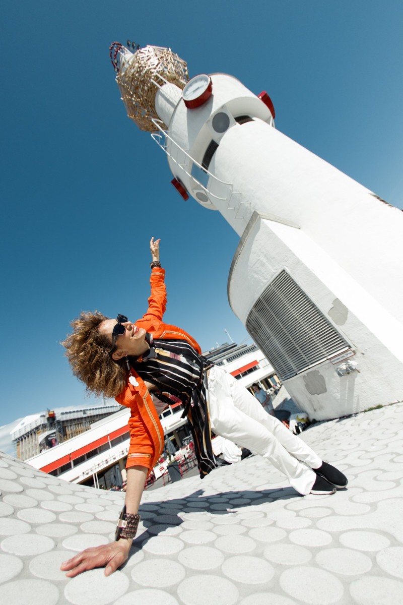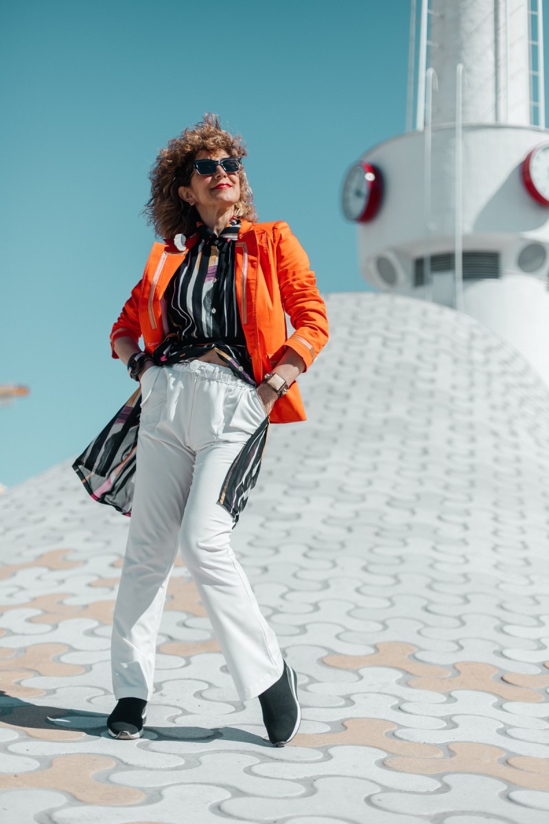 For my London Fashion Week Street Style, It brings a new message for womenswear s/s 2023. Keep looking up, stay positive, and welcome life now. Likewise, The bright orange blazer is ready to make you explore new explosive energy. Above all, It goes perfectly with white straight-line trousers and casual booties.