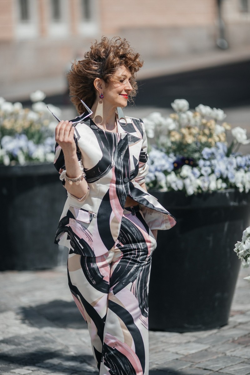 The Printed blazer for women is high on the fashion agenda for London Fashion Week Street Style 2022. The all-time black colour looks so new in this contemporary abstract print design.