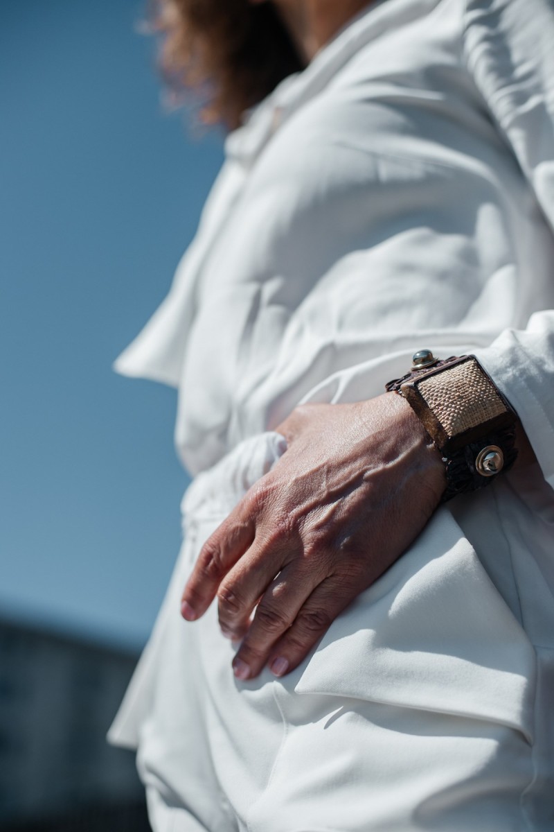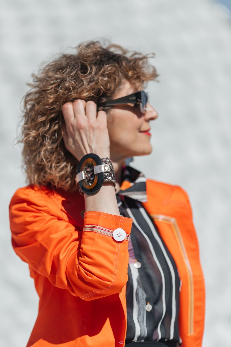 I see cuff bracelets as new freedom of independence. In my eyes, personalization is the new womenswear message for fashion trends 2023. So I loved to combine contemporary materials with coloured stones. Geometrical shapes are in balance with my blazer style. Beautifully finished trims transform this wrist jewellery into a luxurious look. In other words, this summer, the message is clear. Cuffs will be key emblems of post-pandemic freedom, especially when worn as a set.