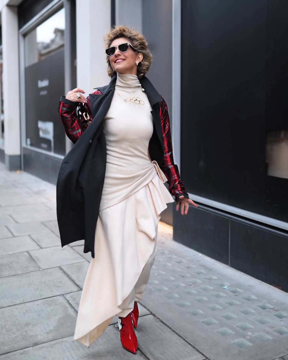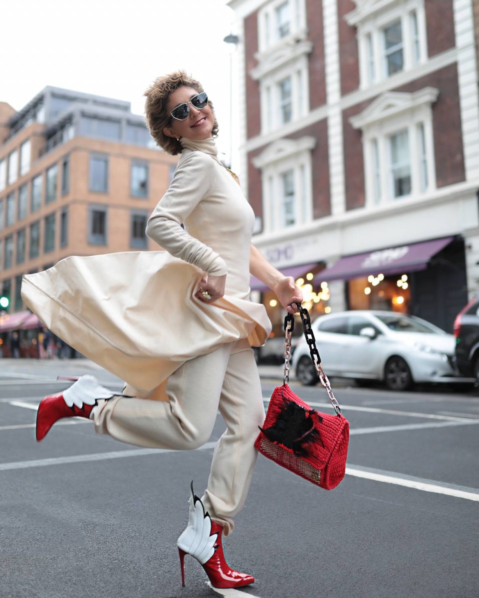 The “Magpie” high heels boots are a surprising boot trend, full of life in ketchup red. One of the hottest trending shoes of the season, full of character, powerful, my love of brights. For this trending boots, I created an outfit in mixture with couture. Geometric cutting in the beige colour of my couture jumpsuit is ideal to fit in with my high heels boots. “Magpie” high heels boots are my desire for challenging sensuality, volume, a bold expression of style. This outfit is an expression of personality and individuality. Dare to wear it. Welcome style. Fashion in London is part of the lifestyle.