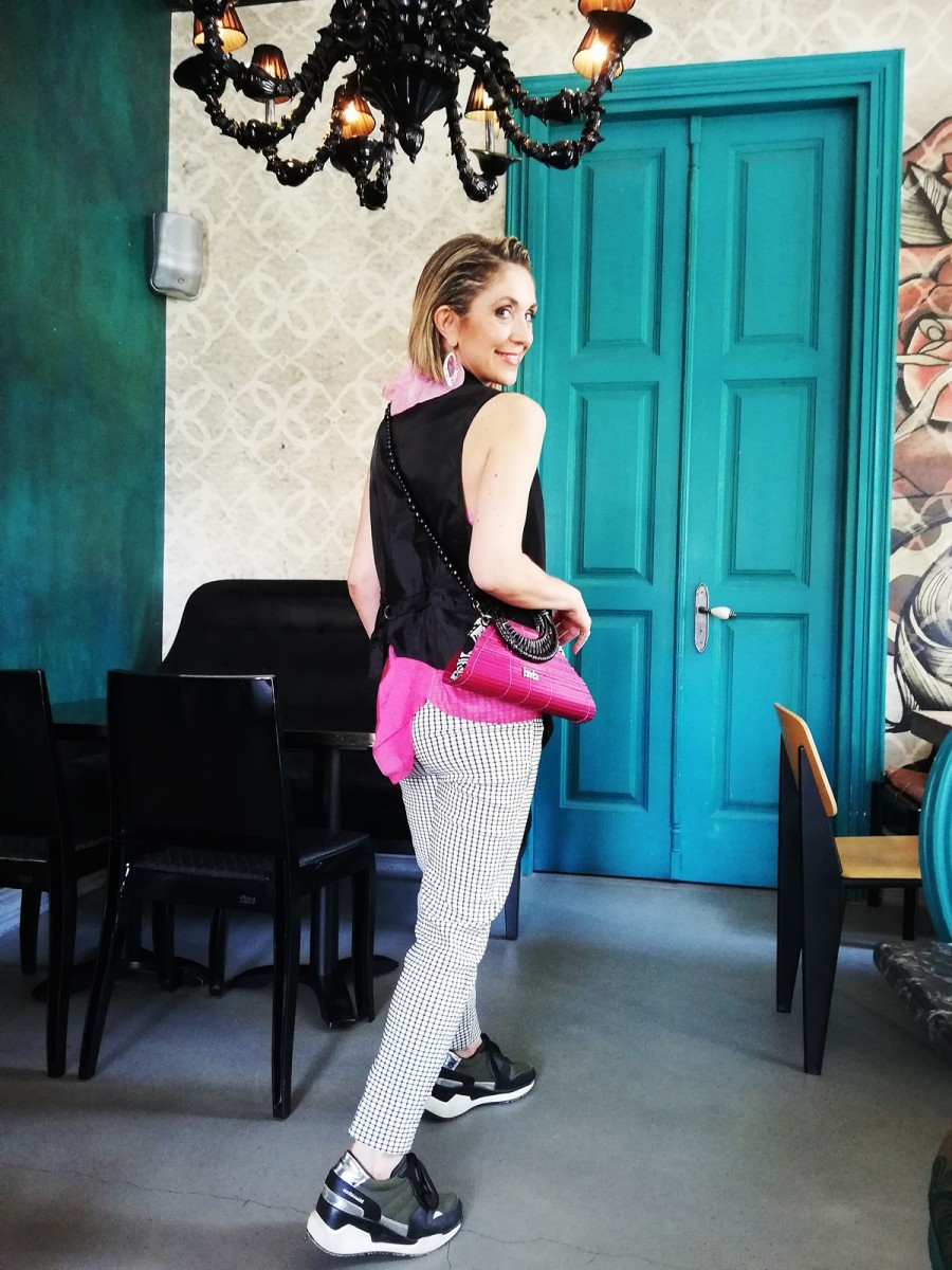 Therefore, my hot pink silk scarf can be transformed into a Fashion Outfit in mixture with contemporary accessories. It happens to be more relevant these days, but you can always wear a silk scarf with sneakers and be in style. The dark green colour of my sneakers is very on-trend for Autumn 2020. Also, I love to mix it with black and hot pink. Moreover, my wet hair looks so feminine.