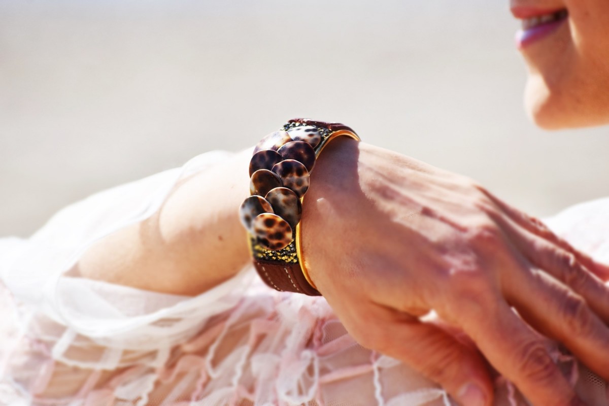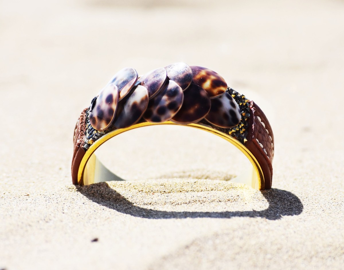 Dress up your casual outfit with a remarkable statement cuff bracelet. This wide Gold Cuff Bracelet in fine synthetic leather will make your look to be exceptional during London Fashion Week. However, wear now this timeless piece. I love the idea of seashell beads with fine dark brown synthetic leather and gold metal. Above all, it looks elegant, stylish, sophisticated, and modern.