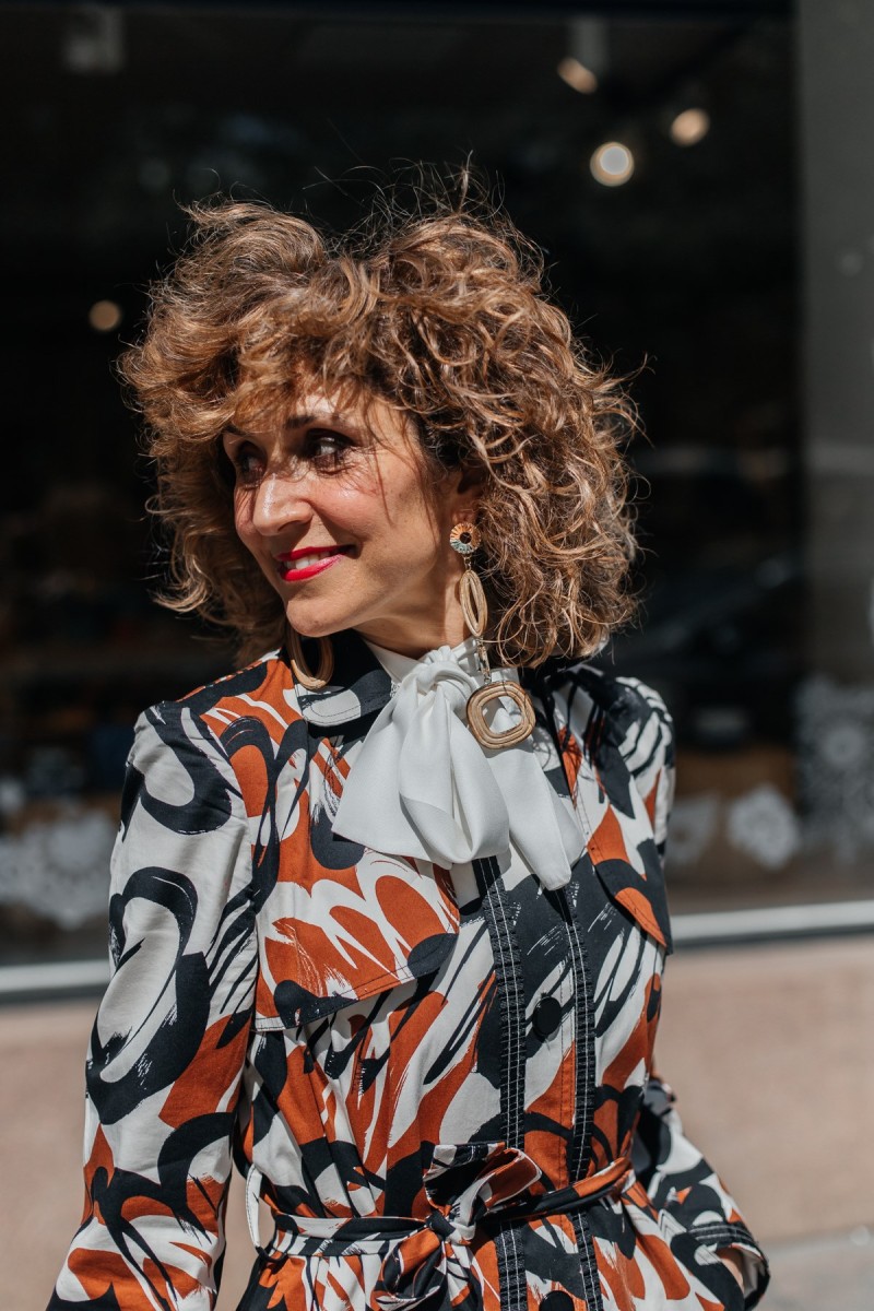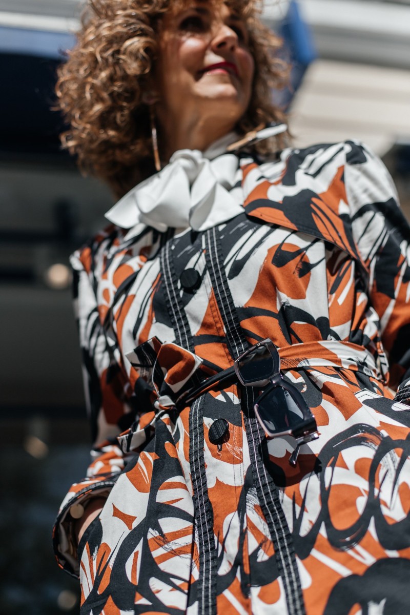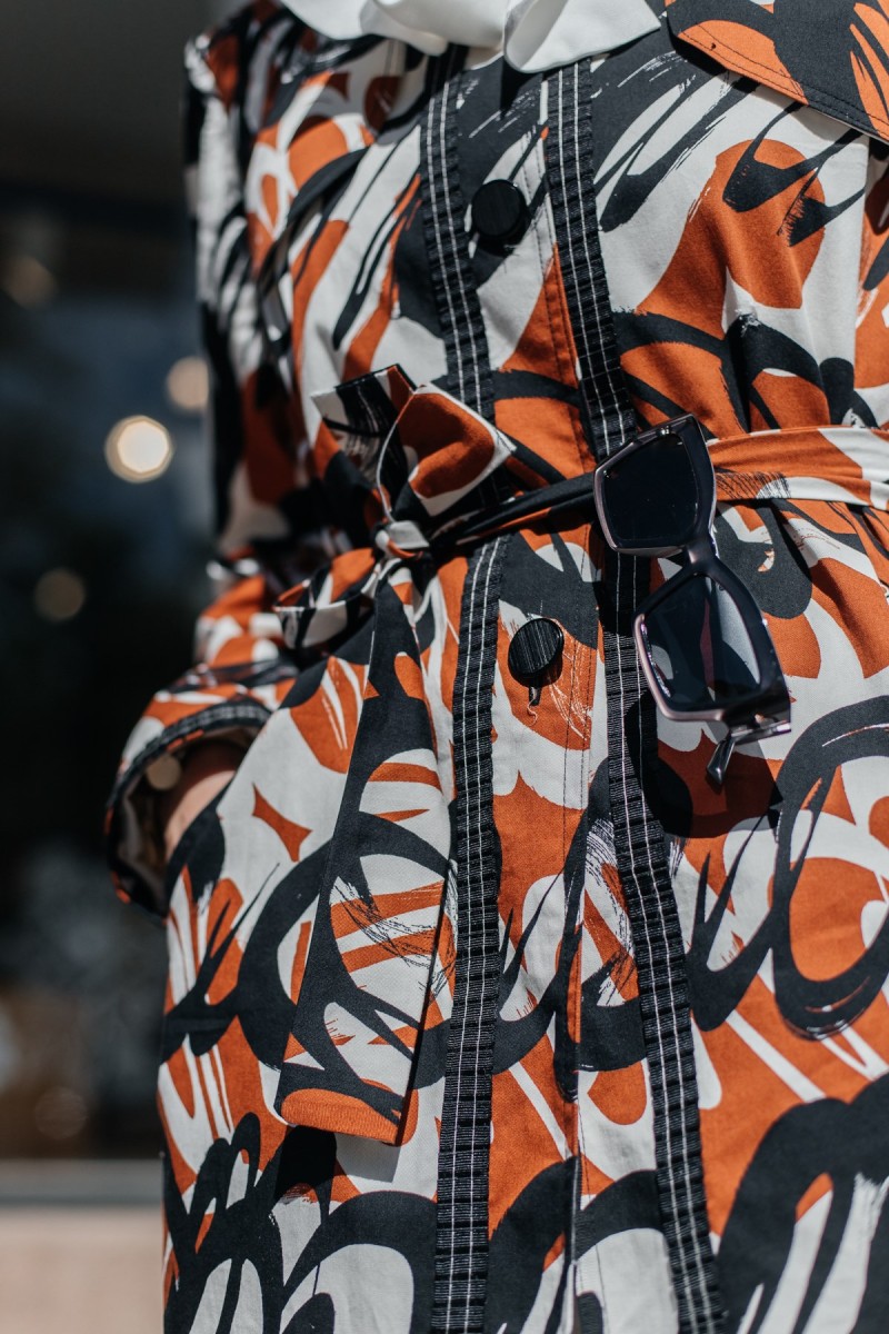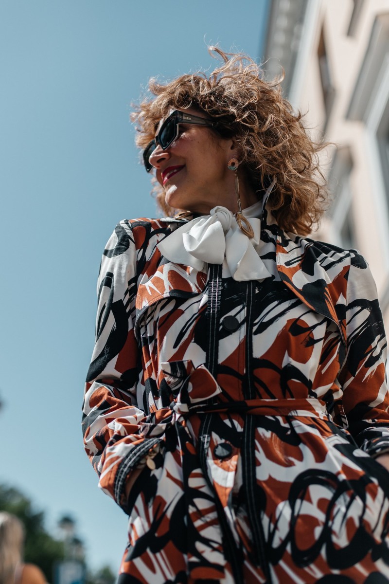 In my eyes, a feminine type of trench coat hit around knee length. Above all, you can wear it with everything. From denim, fluid wide-leg trousers, and belted day dresses to slim-fit trousers, the abstract print trench coat by the Think-Feel-Discover.com collection will inspire your street style outfits in the season ahead. In addition, do not forget: It will flatter your body type even if you are a regular height, tall slim, petite or curvy woman. Haven’t you decided yet? Shop and wear it now!