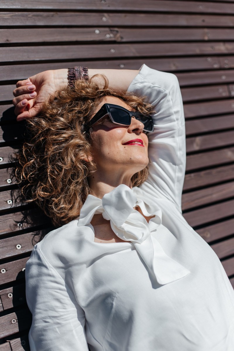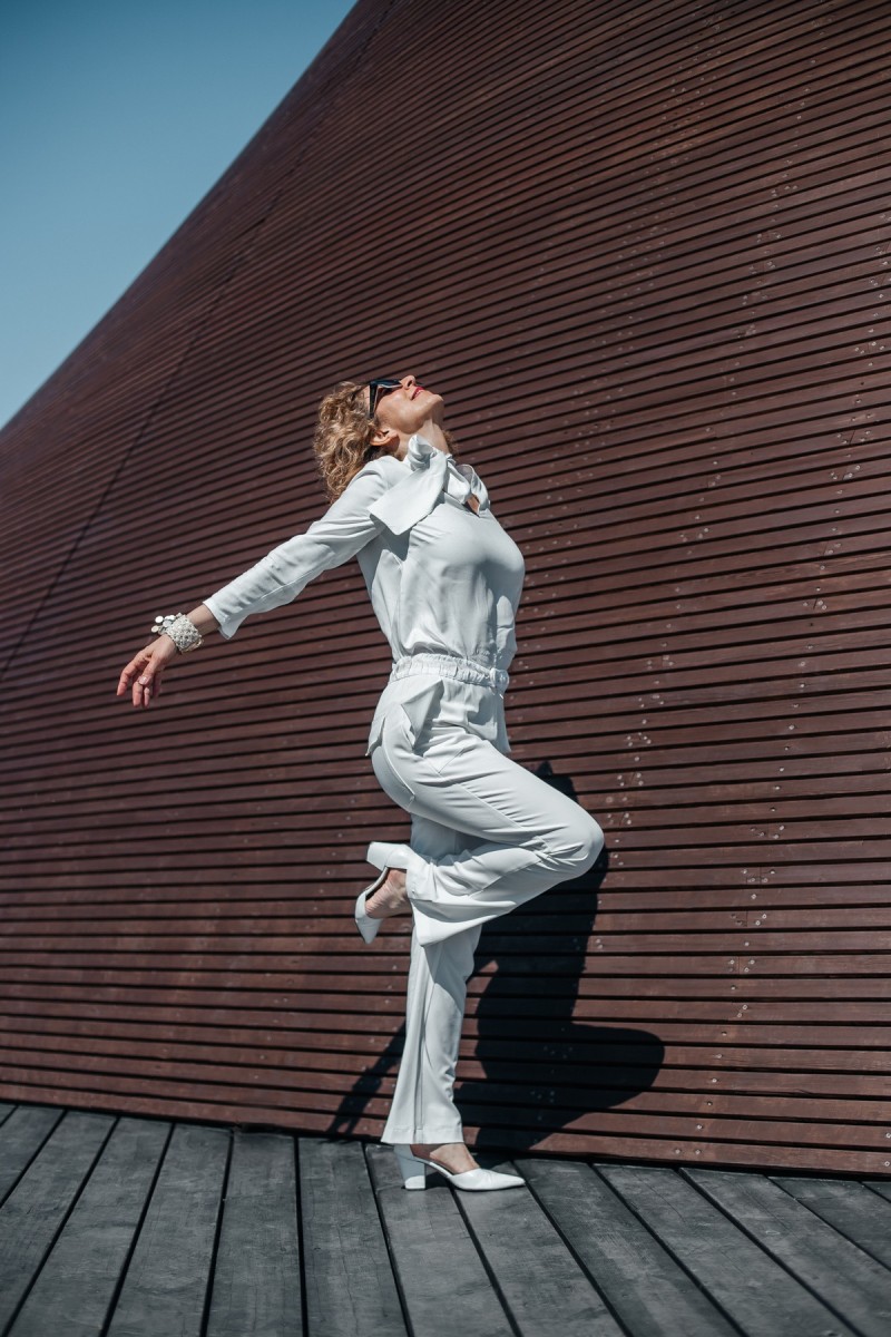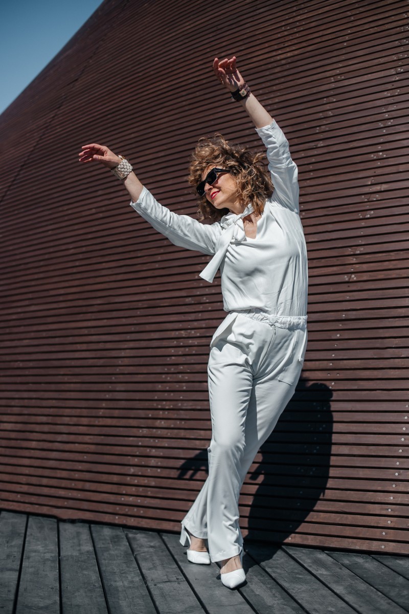 In my creative imagination, a trench coat reflects what the forward-thinking woman wants to wear. Firstly, The trench coat looks great to style with this viscose white bow blouse. It is classic and a must-have in every woman’s wardrobe. Secondly, I am a huge fan and lover of bow blouses in white colours. It looks so stylish with almost all types of skirts and pants. However, it is outstanding with white leg trousers. In conclusion, it contrasts with the traditional colour theme of browns, beiges, and ochres. However, the white bow blouse underlines the authenticity of the look.