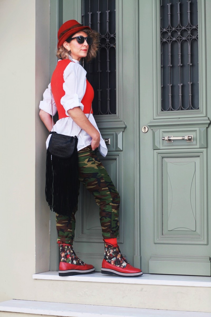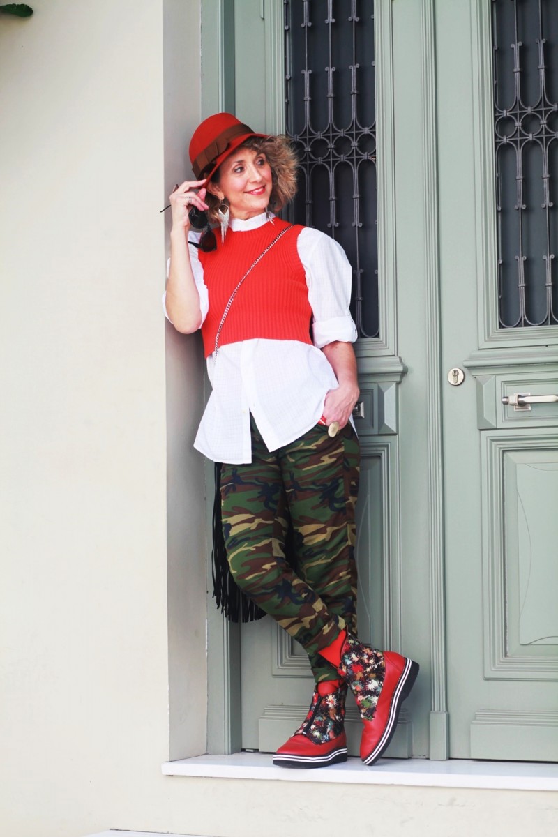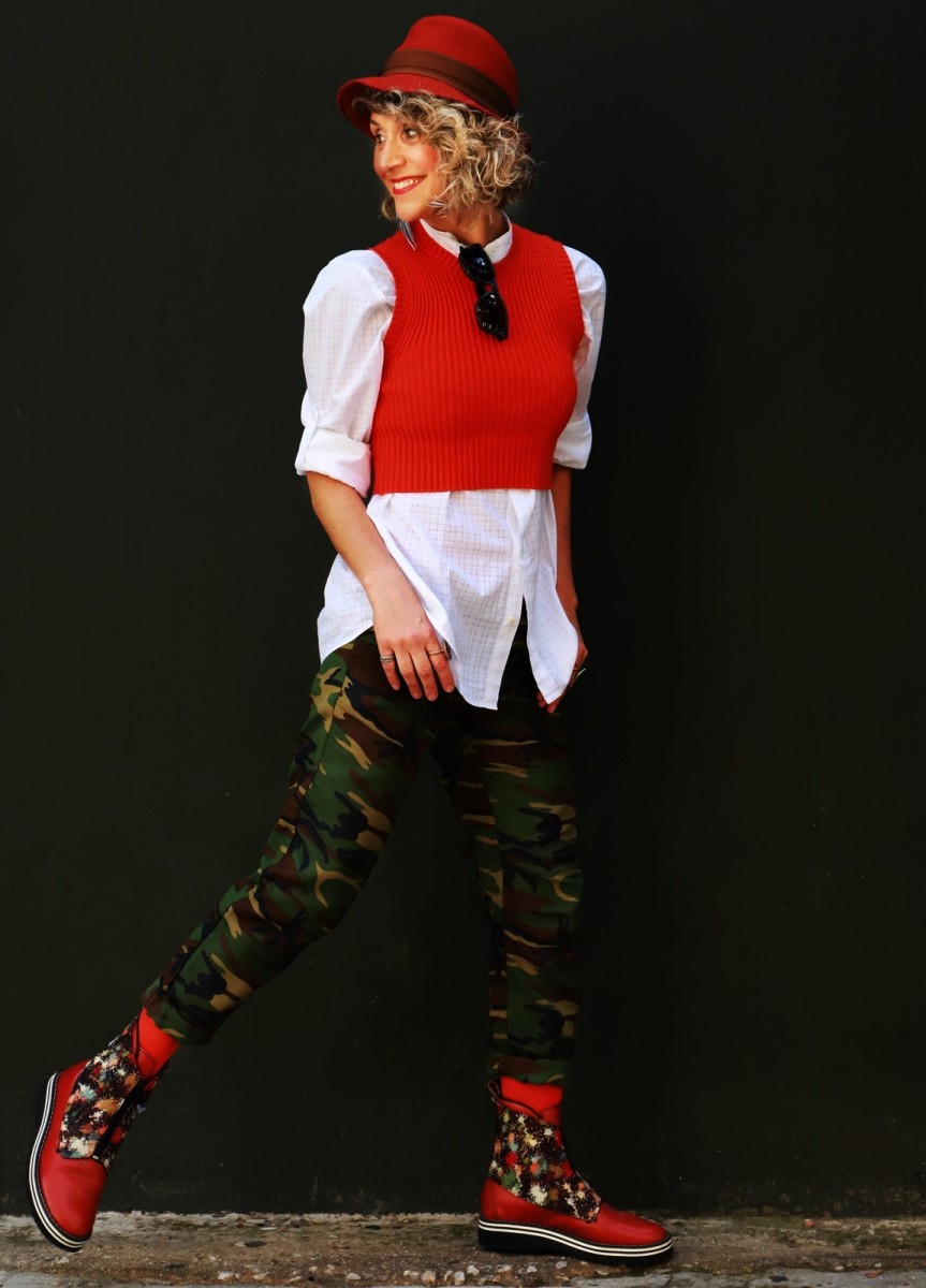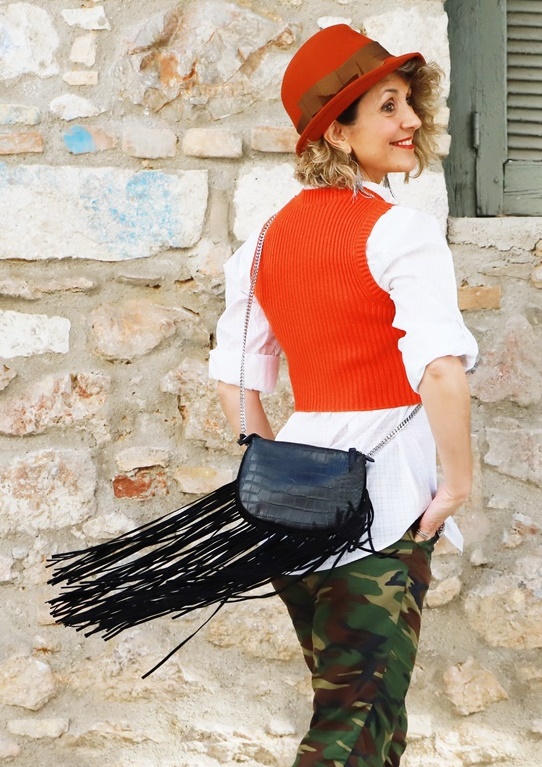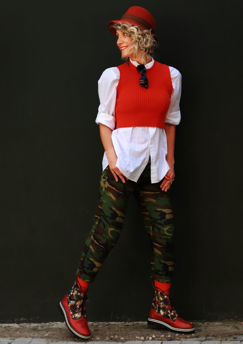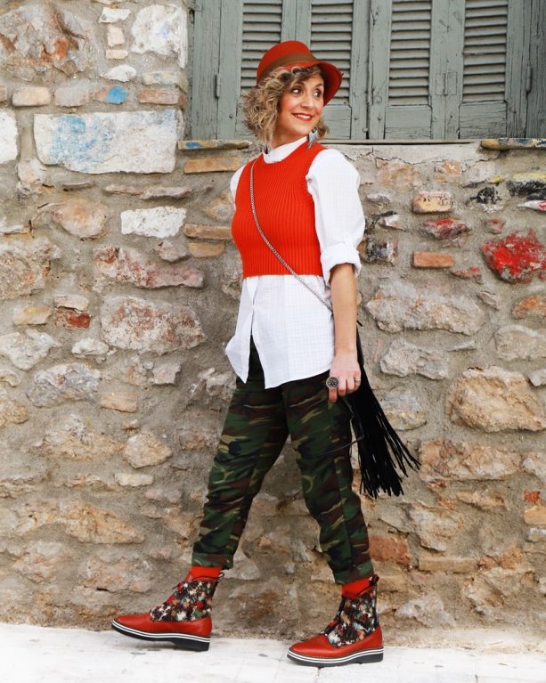 Today, I continue to look for unexpected mixes of street sports and technical innovations. What I do love wearing my camouflage cargo pants is that I feel free to move. Designed from pure cotton is ideal for my casualwear. However, even if it is a menswear theme, I do believe that wearing it with my orange bright crop top offers a new look within womenswear for Autumn/Winter 2020.